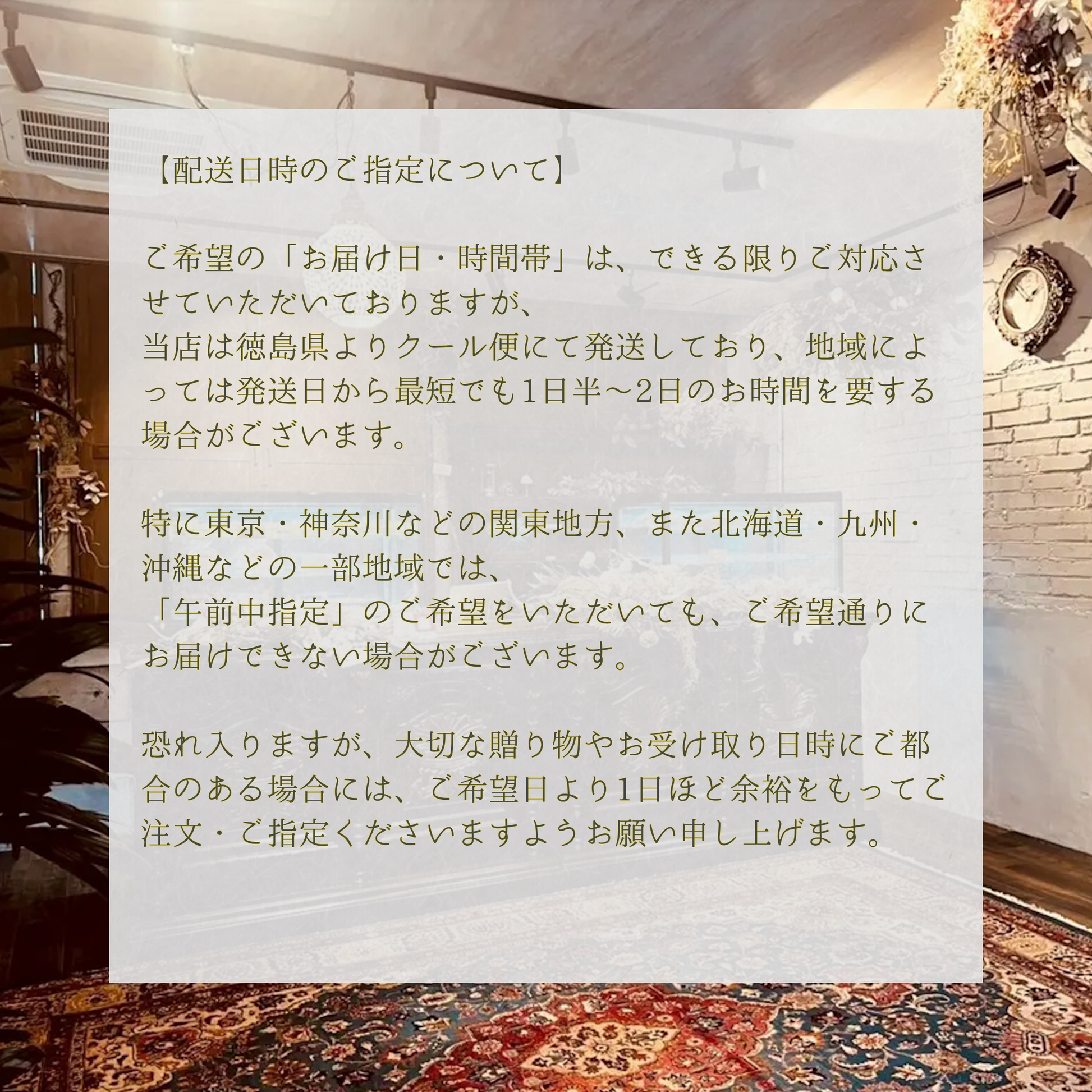 恐れ入りますが、大切な贈り物やお受け取り日時にご都合のある場合には、ご希望日より1日ほど余裕をもってご注文・ご指定くださいますようお願い申し上げます。